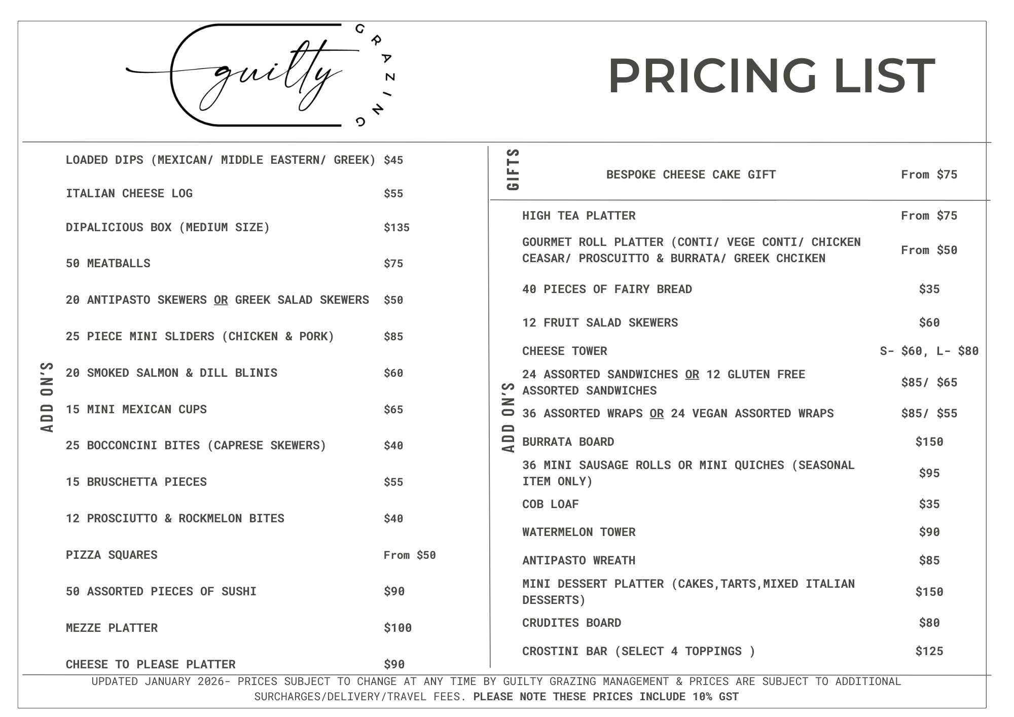 Visit our Grazing Gallery to view our grazing tables & boards as shown here on our price list!